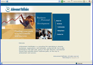 Achievement Pathfinders Achievement Pathfinders is a consulting firm specializing in showing businesses, organizations, and individuals, young and old, how to get positioned on the right path, going in the right direction, and directed toward their individual and/or corporate goals, on the way to achievement and success. Design Objectives In this project for Achievement Pathfinders, it was important for Abgrahic to supply images of successful people, especially images of people in the process of trying to achieve their goals. Abgraphic also wanted to echo the design of its client's business cards. It was also important in this project to highlight the different types of consulting that the client does. To that extent, all of these three objectives were achieved. |